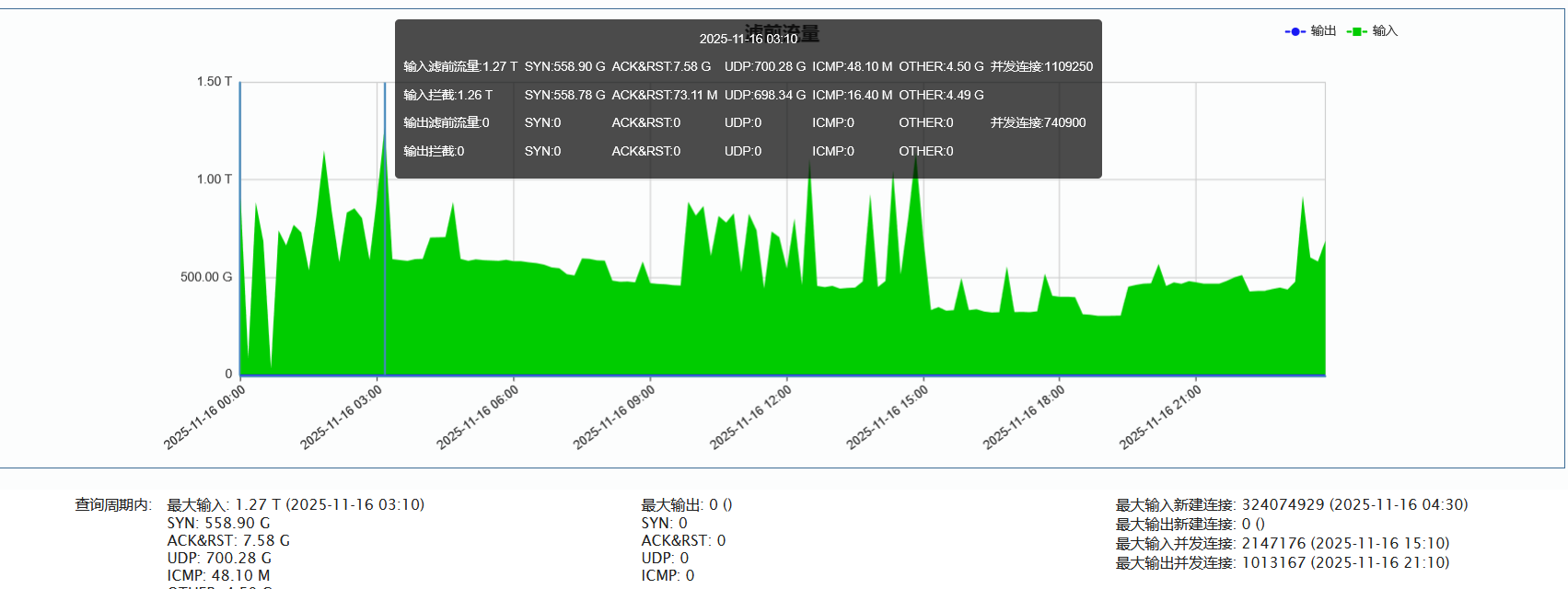 ►单次最大攻击流量 1.27 Tbps(发生于 2025-11-16 03:50至03:00时段)