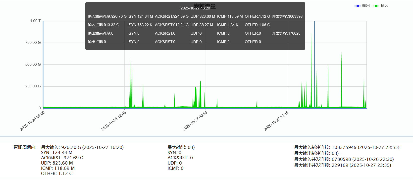 ►单次最大攻击流量926.70 Gbps(发生于 2025-10-27 16:10至16:20时段)