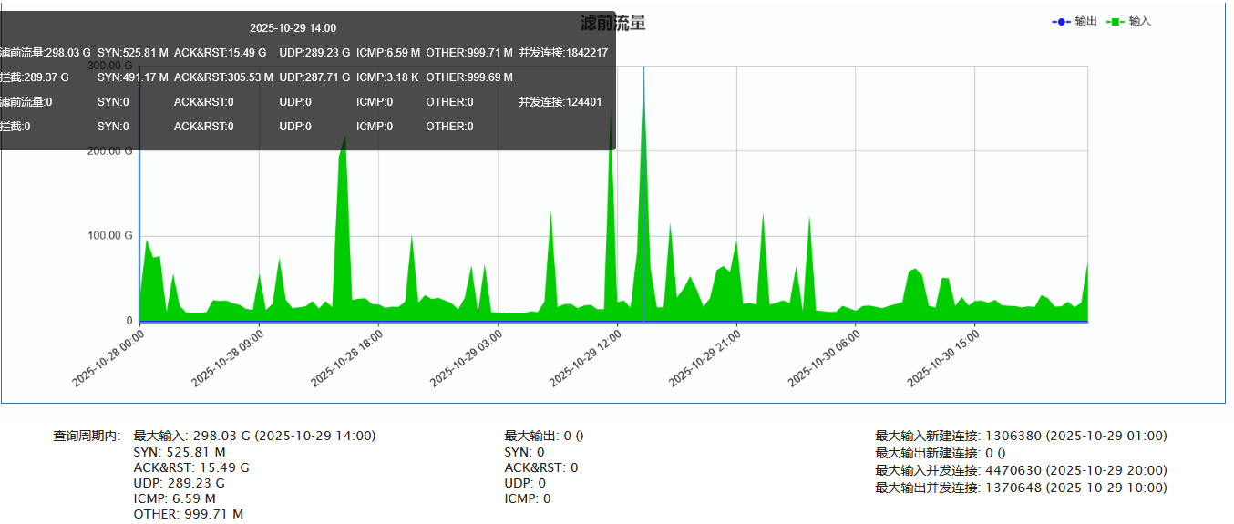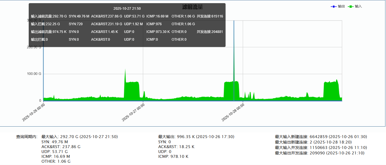 ►联通方向:单次最大攻击流量为292.70 Gbps(发生于2025-10-27 20:50至21:00时段)