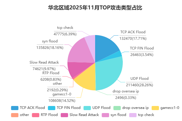 本月,华东、华中、华北、香港、北美等重点区域均出现大量攻击行为,其中不乏规模超过百Gbps 乃至 Tb 级的高强度攻击。攻击类型覆盖 SYN Flood、UDP Flood、ACK&RST Flood、ICMP Flood 等多种主流方式,部分区域攻击持续时间显著拉长,呈现出明显的混合型、多阶段化特征。