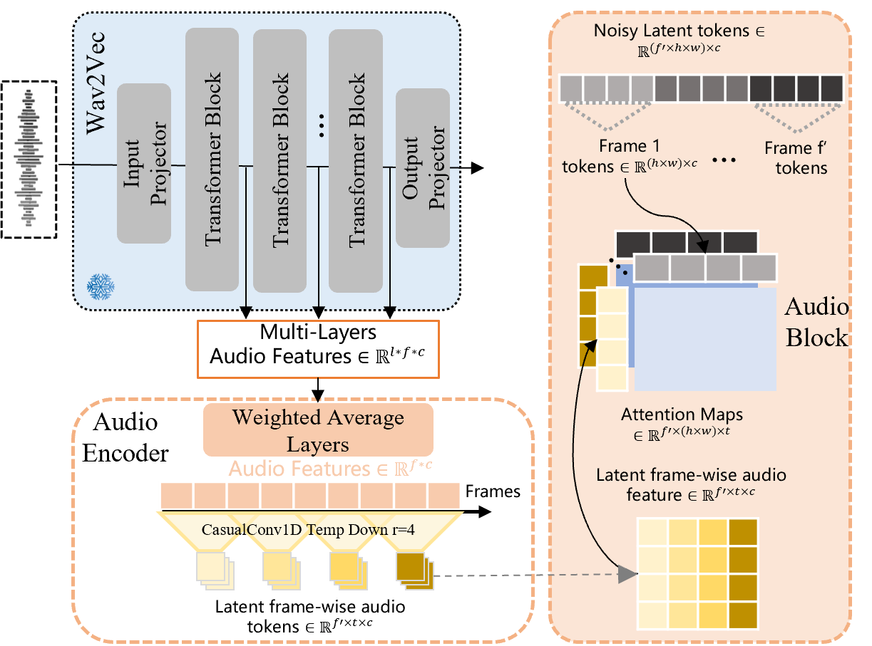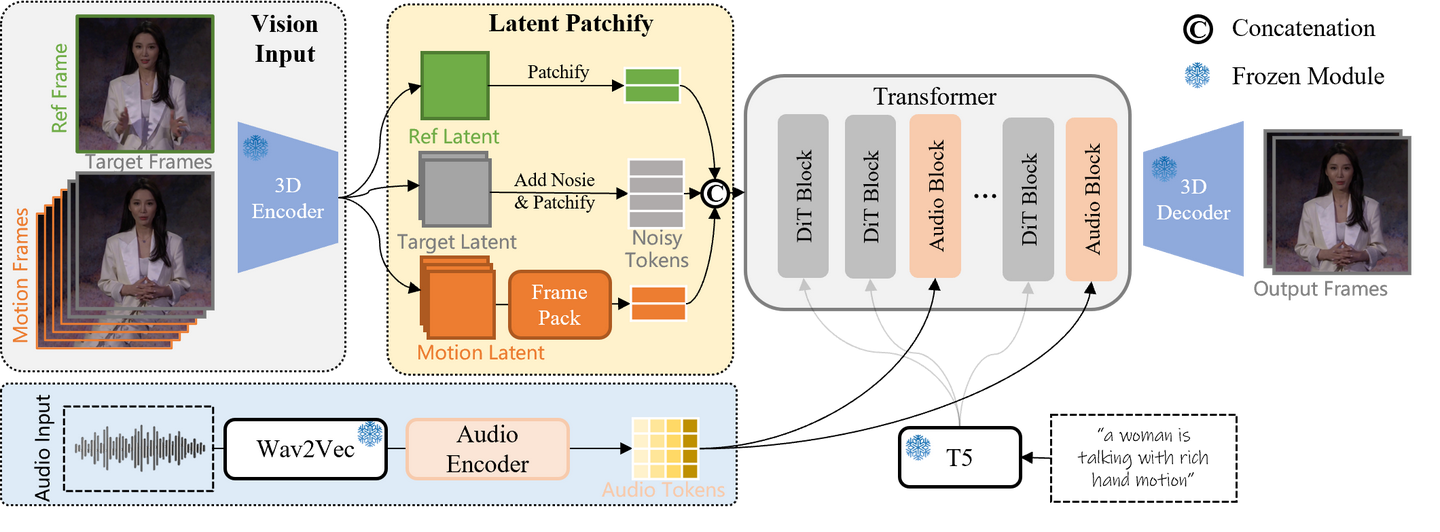 给定单张参考图,输入的音频和文本用来描述视频内容,模型会保留参考图的内容,生成与输入音频同步的视频。生成的视频第一帧不一定跟输入的参考图一样,因为模型只约束生成的视频保留参考图的内容,而不是从参考图作为首帧开始生成。模型的原始输入会被提取为多帧噪声隐向量,训练时的每个时间步对连续的视频隐向量去除噪声。测试时,模型同时接收音频、文本和参考图的条件输入,从噪声开始不断去噪生成最终的视频。