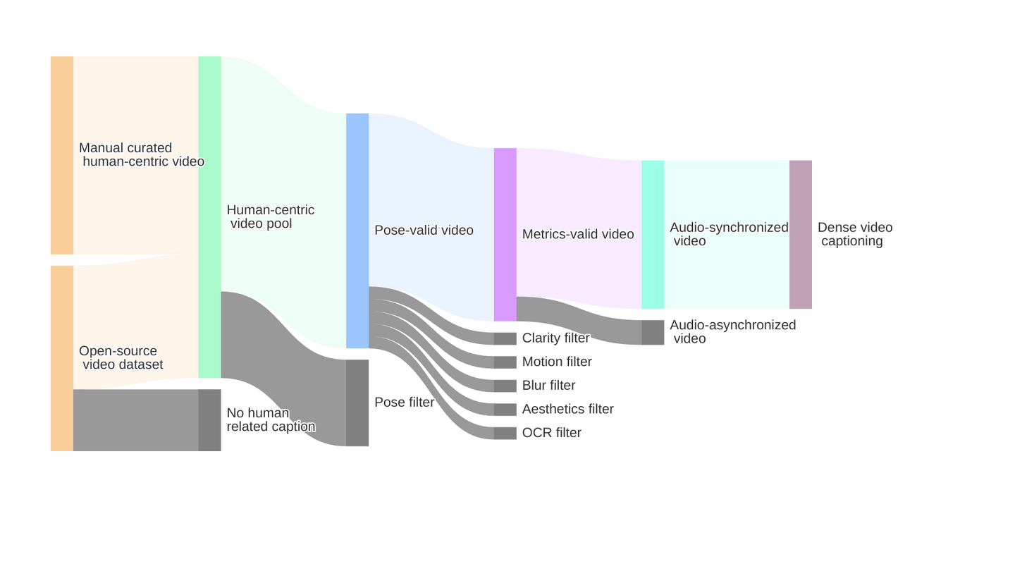 通义团队通过大规模数据集(OpenHumanVid、Koala36M)的自动筛选和高质量样本的手动策划策略,专注于收集处理包含人类角色参与特定活动(如说话、歌唱、跳舞)的视频,创建了一个包含数百万以人为中心的视频样本的综合数据集。