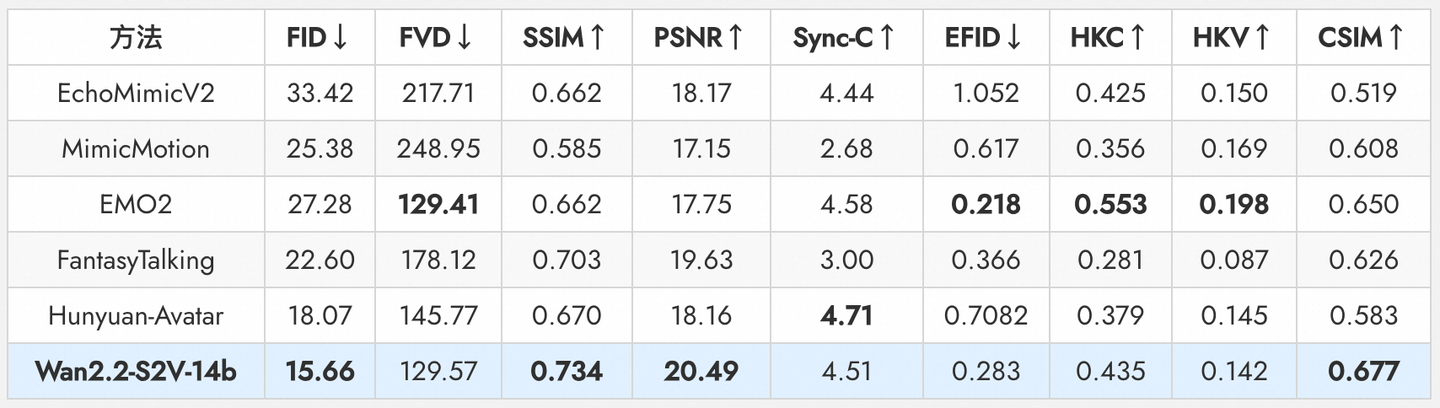 通义团队在EMTD数据集上进行了定量评估,与多个最先进方法比较,Wan2.2-S2V-14B模型在多个指标上实现了卓越性能。