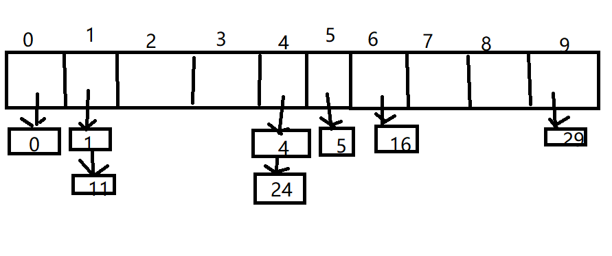 散列表的数据类型为指向结构体HashTbl的指针,其包括表示表大小的TableSize和用于存储数据的链表数组,这个数组的每个位置对于一个链表,当同一个位置有多个元素时,就让这多个元素组成一个链表挂在数组的这个位置上,这样就处理了冲突的情况。其结构可以理解成这样: