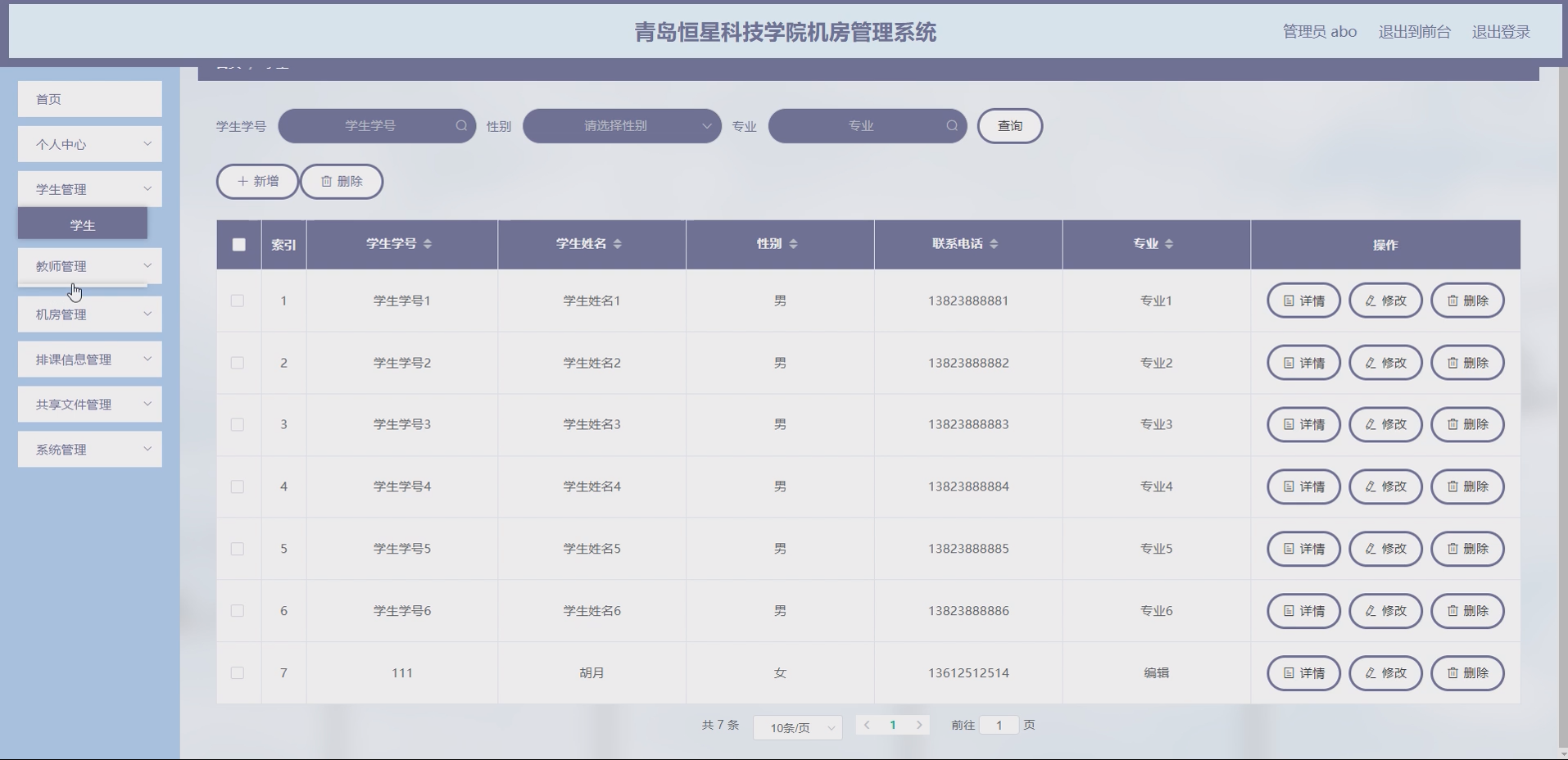 一套基于SSM框架的青岛恒星科技学院机房管理系统,包含学生、教师、机房、排课信息、共享文件等核心管理模块,能够正常运行并满足学院机房管理需求;