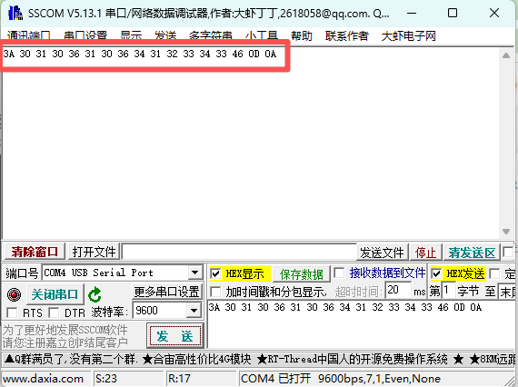 随后又通过串口助手回复PLC数据:3A 30 31 30 36 31 30 36 34 31 32 33 34 33 46 0D 0A