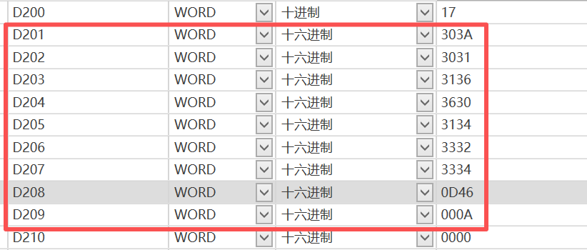 D204=16#3630、D205=16#3134、D206=16#3332、D207=16#3334、D208=16#0D46、D209=16#000A