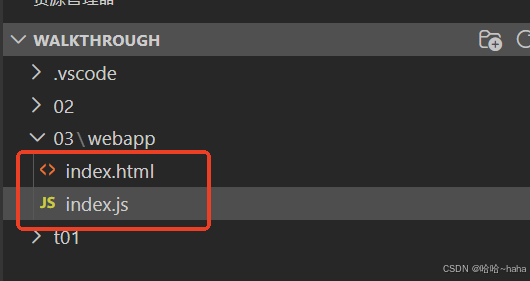 1.新建文件夹03,03下新建一个文件夹webapp,分别新加两个文件03\webapp\index.html和03\webapp\index.js如下