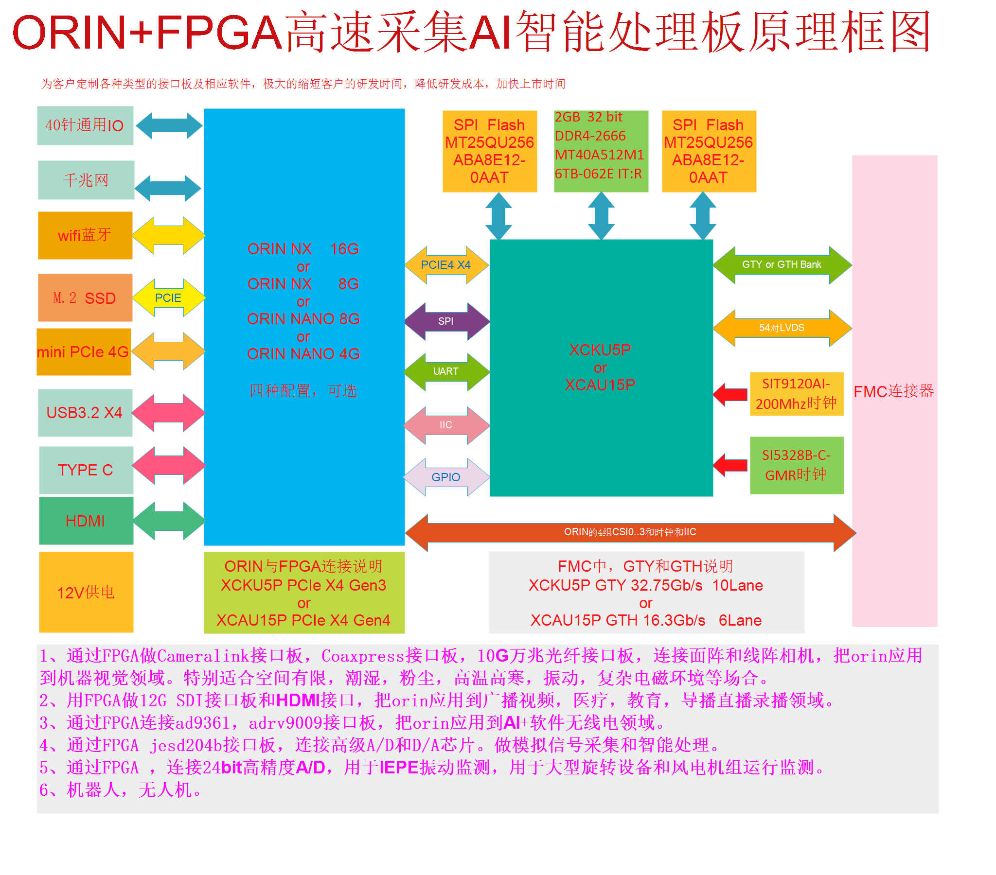 经过了一年多的酝酿,跟很多客户进行了沟通,我们开发了一款ORIN+FPGA的板卡,配合各种FMC接口板,满足多个应用场景的需求。FMC接口板只是应用了FMC连接器,并不是标准的FMC板卡的大小和形状,接口板的大小和形状配合ORIN+FPGA板的大小和形状。在这里解释一下,我们在设计之初,打算采用核心板+底板的传统方式,但发觉这种方式需要客户做的事情太多,需要做一个底板,需要做相关的底层驱动。所以我们最终考虑决定采用主板+接口板的形式,并还可以为客户定制接口板,写底层软件,可以使客户聚集精力,仅仅开发自己有创新的部分技术,极大的减少了客户的工作量,减少了产品研发的风险,加快了产品上市时间。我们初步考虑了,下述应用场景:
