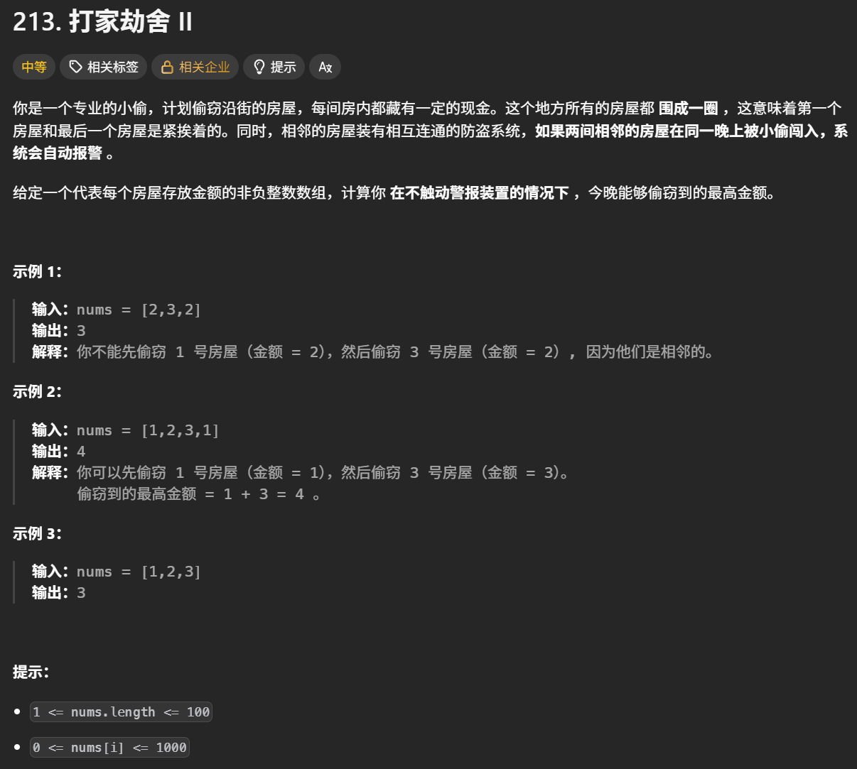 思路:这道题是在198.打家劫舍的基础上,出现了环。对于一个数组,成环的条件主要有如下三种情况。