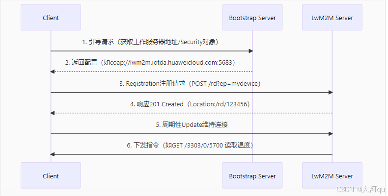 在LwM2M(Lightweight Machine-to-Machine)协议中,实现LwM2M客户端与服务器互联的接口是 Registration(注册接口)。客户端通过注册接口向服务器发送自身信息(如设备ID、支持的对象资源、生命周期等),完成双向身份认证与绑定。注册成功后,服务器为客户端分配唯一标识符(如Endpoint Name),建立持久通信通道。这里的服务器是指,工作服务器(LwM2M Server),而非引导服务器(Bootstrap Server)。引导服务器,提供临时连接,配置完成即断开,使用的是引导接口,提供初始配置。
