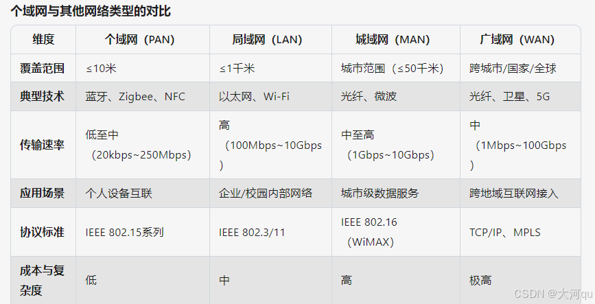 其核心设计目标是解决以下问题: IPv6与低功耗设备的兼容性、自组网能力、自组网能力、端到端IP通信等。个域网(Personal Area Network, PAN)是一种围绕个人或小型设备组件的短距离通信网络,旨在实现设备间的资源共享和数据传输。其覆盖范围通常在10米以内,适用于个人或小群体场景,如家庭、办公室或随身携带的智能设备互联。蓝牙(Bluetooth)是最主流的PAN技术,Zigbee(一种应用于短距离和低速率下的无线通信技术)、NFC、红外(IrDA)等都属于PAN无线技术范畴;USB、M-Bus等有线技术,也可以归到PAN范畴。