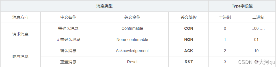 在下列CoAP协议定义的报文类型中,哪一项表示应答消息?
