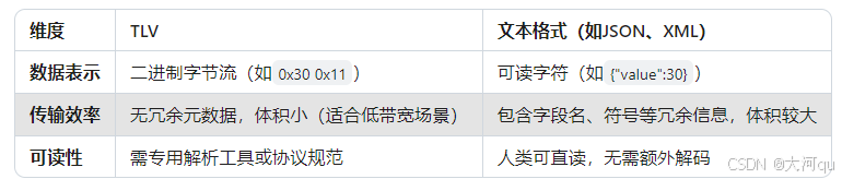 一些常见的数据格式:CBOR(Concise Binary Object Representation)轻量级二进制编码,兼容JSON数据结构但体积更小,适用于低带宽网络。TLV(Type-Length-Value)本质上是一种二进制编码格式,而非文本格式。其核心设计目标是通过紧凑的二进制结构实现高效的数据传输和灵活的可扩展性。TLV的三个字段(Type、Length、Value)均以二进制字节流形式存储和传输。