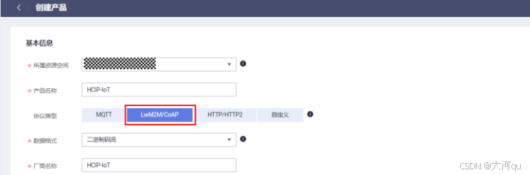 我们在物联网平台实验中,创建产品时,选择的协议类型是 LwM2M/CoAP,