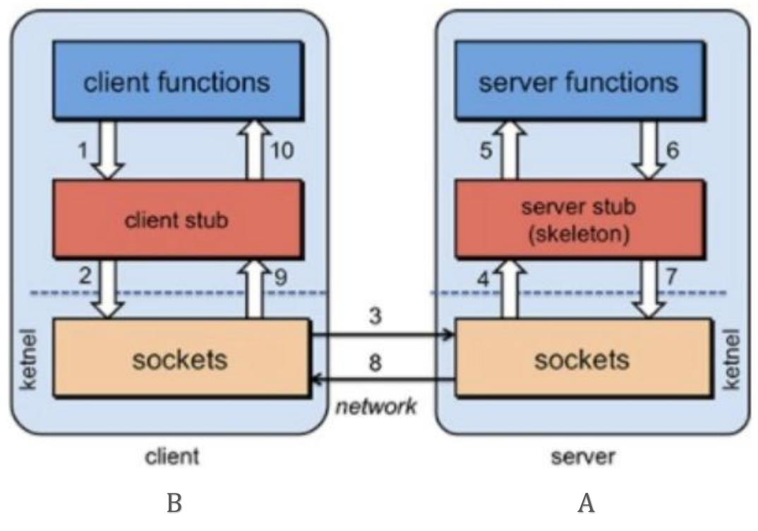 在服务器端 A,服务端 stub 通过 Socket 连接从客户端 stub 中接收请求,将调用的信息解包,然后调用真正服务对象上的同名方法。所以对于提供远程服务的服务对象来说,调用是本地的,来自服务端 stub,而不是远程客户。服务端 stub 从服务中得到返回值,将它打包,然后传送回到客户端 stub(通过网络 Socket 的输出流),客户端 stub 对信息解包,最后将返回值交给客户对象。