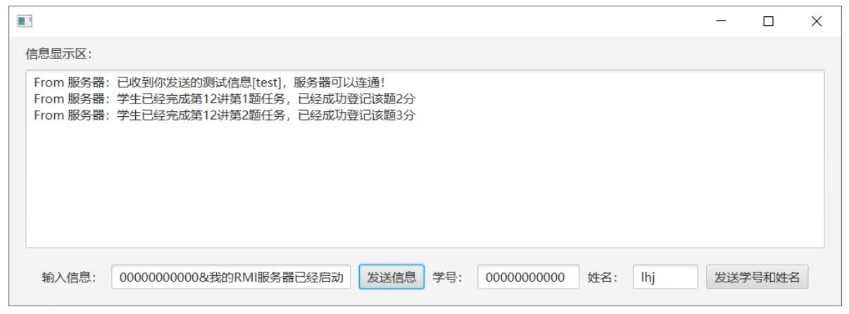 (2)输入信息的文本框中输入"学号&我的RMI服务器已经启动",例 如输入 20181111111&我的RMI 服务器已经启动,(上面的信息中没有空格, 注意不要直接复制上面的内容,可能会带入空格),然后再通过"发送信息" 按钮发送,教师端将调用你实现的远程方法,如果方法实现正确,教师端将返 回获得3 分的信息。