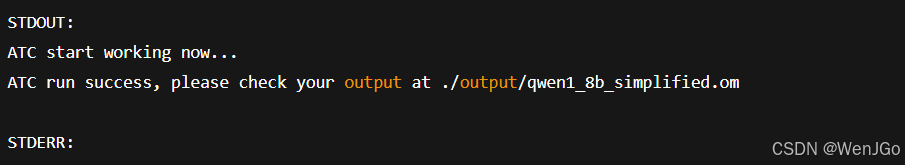INFO\] acl init success \[INFO\] Device 0 start initializing... \[INFO\] Create context success, device_id = 0 Ascend 环境初始化完成 \[INFO\] Begin to load model from file: ./qwen1_8b_simplified.om \[INFO\] Model load success. model_id = 1001, model_name = qwen1_8b_simplified 模型加载成功: ./qwen1_8b_simplified.om \[INFO\] Create model desc success. \[INFO\] Model input count: 1, output count: 1 模型描述信息加载完成 \[INFO\] Prepare input dataset... \[DEBUG\] Input shape: (1, 16), dtype: int32 输入数据准备完成 \[INFO\] Allocating output buffer... \[DEBUG\] Output buffer size: 32768 bytes 输出缓冲区创建完成 \[INFO\] Start model inference... \[INFO\] Executing model, please wait... 推理执行完成,返回码: 0 \[INFO\] Copying output data from device to host... \[DEBUG\] Device to host memcpy success. 推理结果示例: \[0.0321 0.0184 0.0259 0.0412 0.0375 0.0468 0.0283 0.0339 0.0227 0.0315