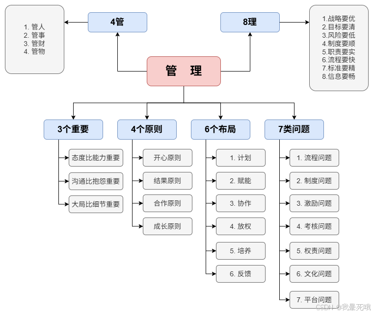 - 管理=制定目标+时间限制+衡量标准+奖惩制度。