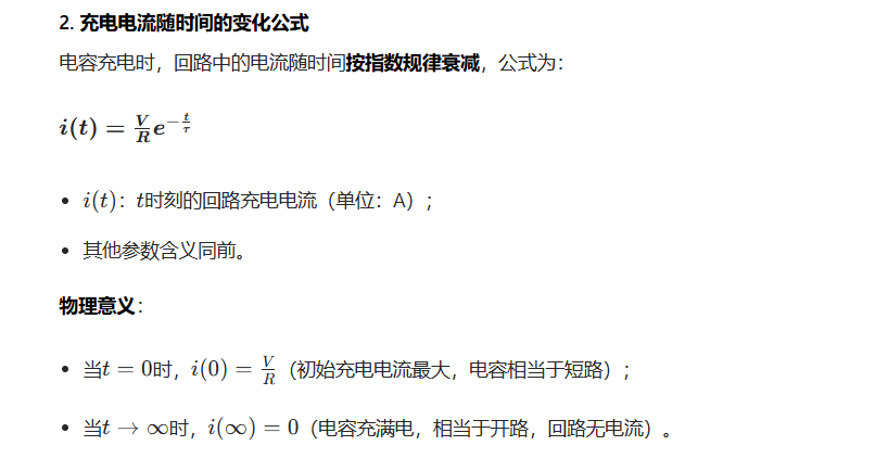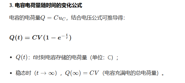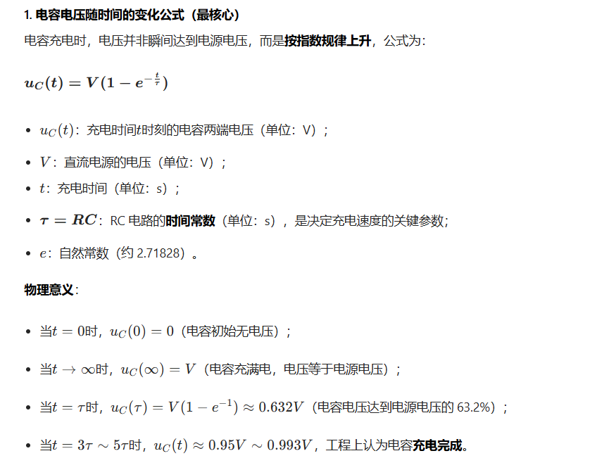 电容的充电过程主要发生在RC 串联电路 中(电阻 R 与电容 C 串联后接直流电压源),其核心公式围绕电容电压、充电电流、电荷量 随时间的变化规律展开,同时涉及时间常数这一关键参数。以下是完整的充电电路公式及推导、应用解析: