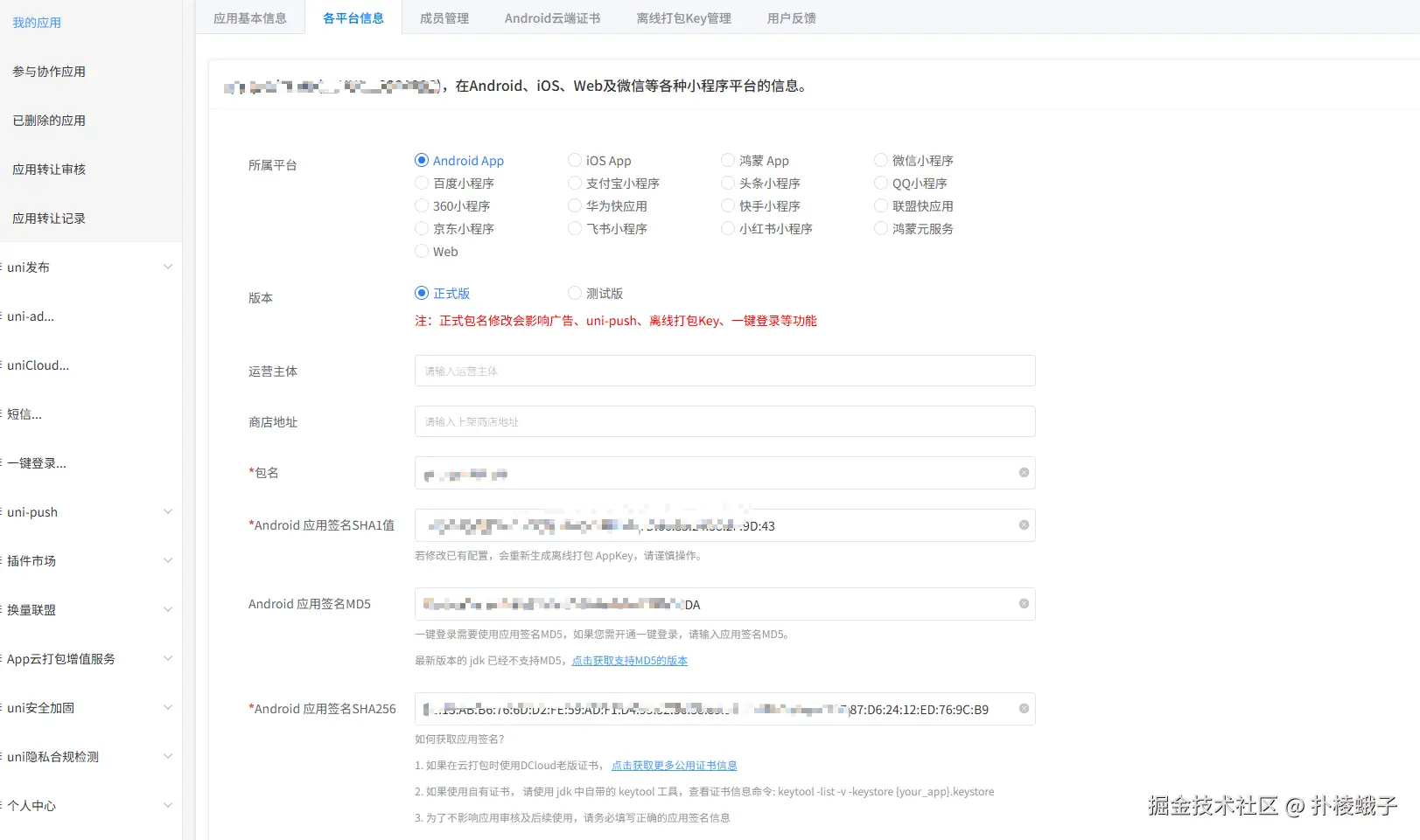 - 这里需要填写的包名、应用签名 ,必须与上一步制作自定义基座时使用的证书信息完全一致。你可以在"香蕉云编"等工具生成证书的页面找到对应的 MD5 或 SHA1 签名。
