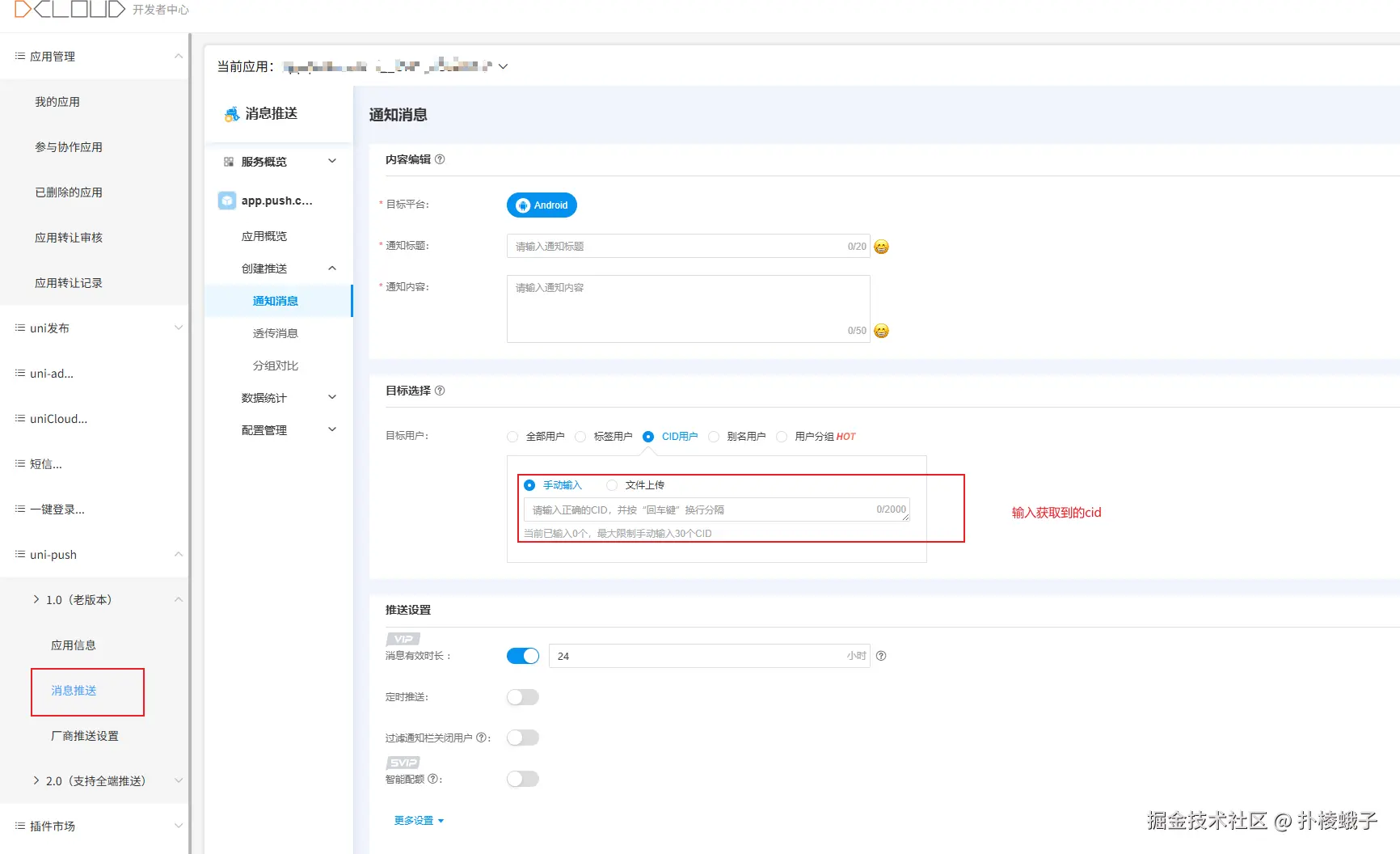 - 推送方式选择 "单播(CID)" ,将上一步获取的 CID 填入。
