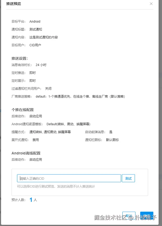 - 填写推送标题、内容。内容应尽量模拟真实场景(如"欢迎使用"、"订单已发货"),避免使用"test"、"aaaa"等测试文本,以防被系统或厂商通道误判为骚扰信息而拦截。