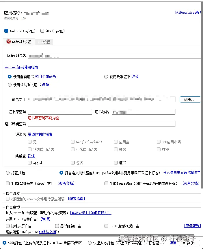 - 证书生成 :可以使用在线工具如 香蕉云编 快速生成调试证书(.keystore 文件),妥善保存密码及别名信息。