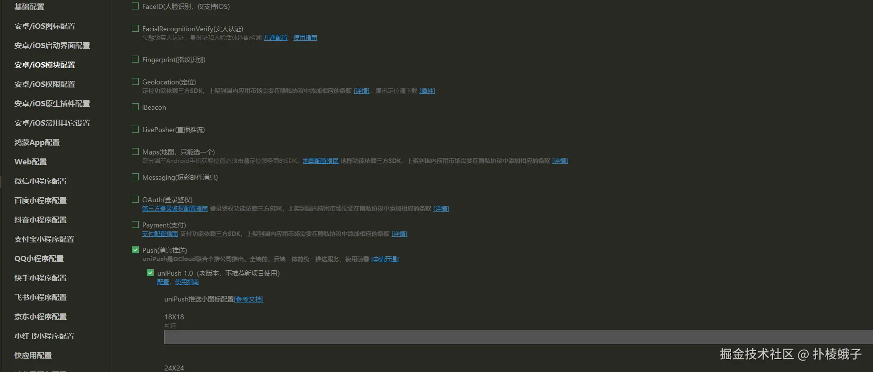 manifest.json文件,进入 "App模块配置" 选项卡,勾选 "Push(消息推送)" 模块,并确保选中 "UniPush" 作为具体服务。