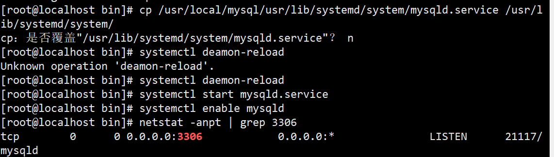bashcp /usr/local/mysql/usr/lib/systemd/system/mysqld.service /usr/lib/systemd/system/ systemctl daemon-reload systemctl start mysqld.service systemctl enable mysqld # 开机自启 netstat -anpt | grep 3306 # 验证端口 -