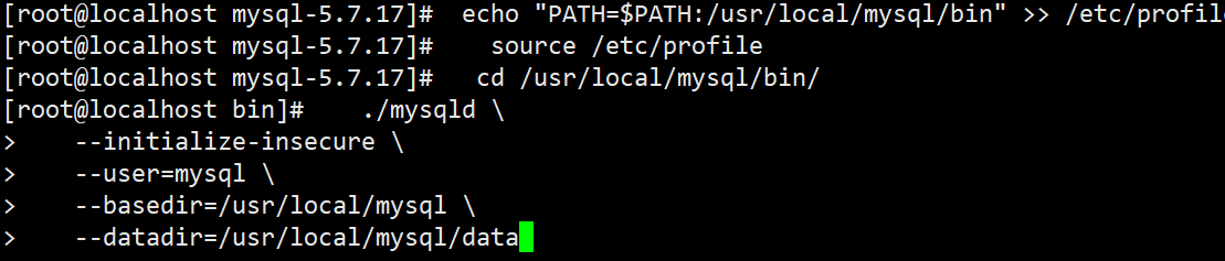 bashcd /usr/local/mysql/bin/ ./mysqld \ --initialize-insecure \ --user=mysql \ --basedir=/usr/local/mysql \ --datadir=/usr/local/mysql/data