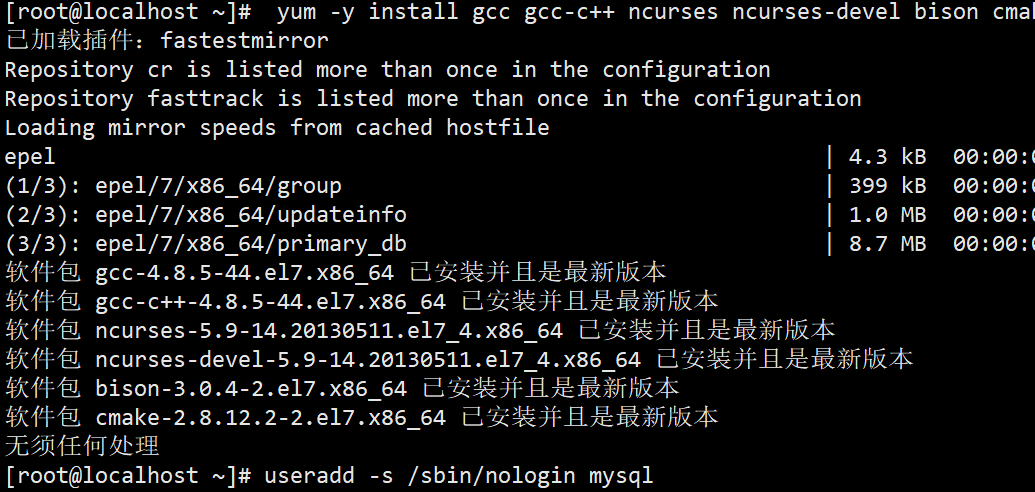 bashyum -y install gcc gcc-c++ ncurses ncurses-devel bison cmake(gcc/gcc-c++:编译工具;ncurses/ncurses-devel:字符终端交互库;bison:语法分析器;cmake:MySQL编译工具)