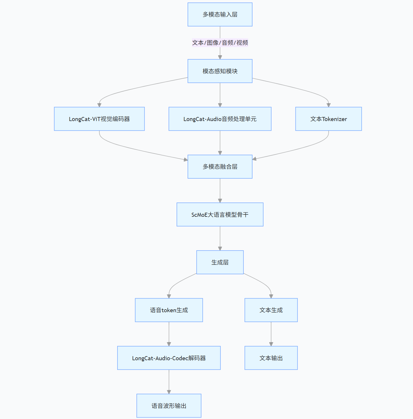 LongCat-Flash-Omni 采用端到端全模态架构,通过 "感知 - 融合 - 生成" 三级链路实现多模态信息的无缝处理。其核心设计理念是构建一个统一的语义空间,让文本、图像、音频、视频等异质模态数据能够直接交互,无需复杂的中间转换模块。