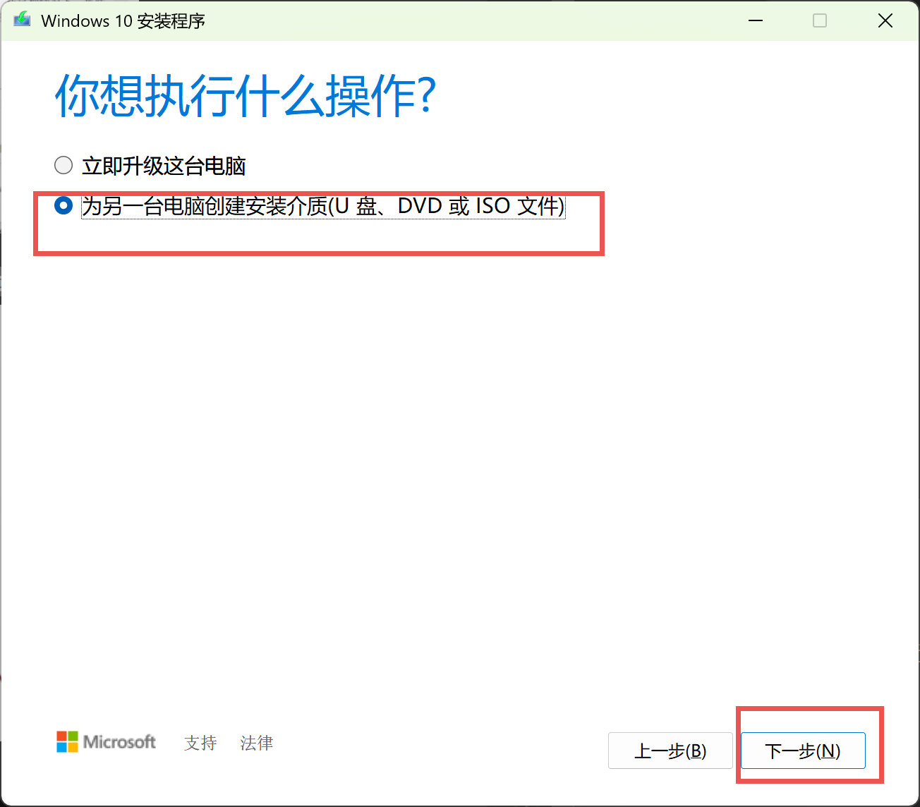 运行工具后,接受许可条款,然后在 "你希望做什么?" 页面选择: