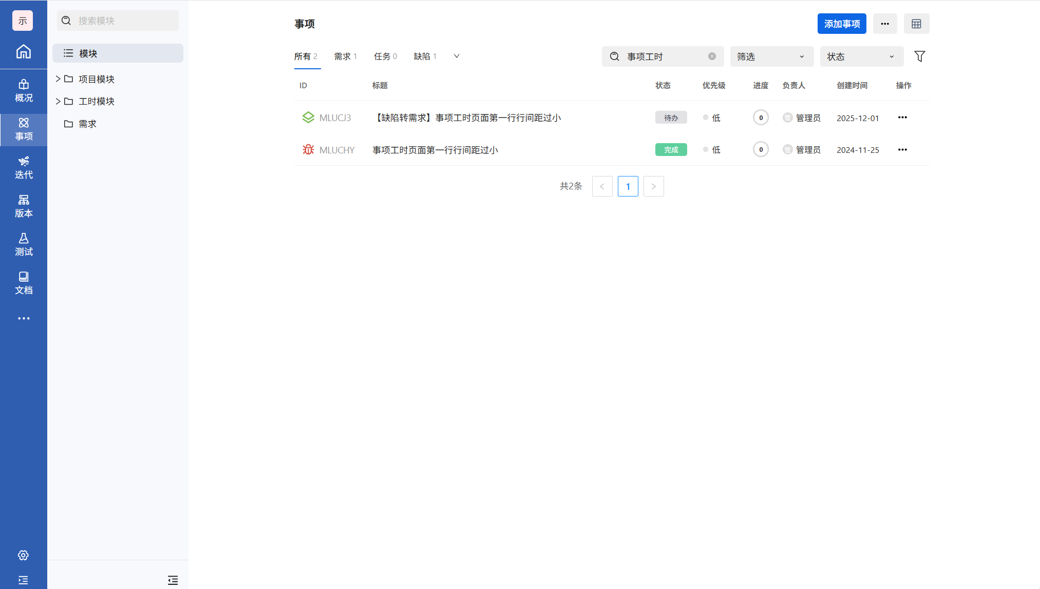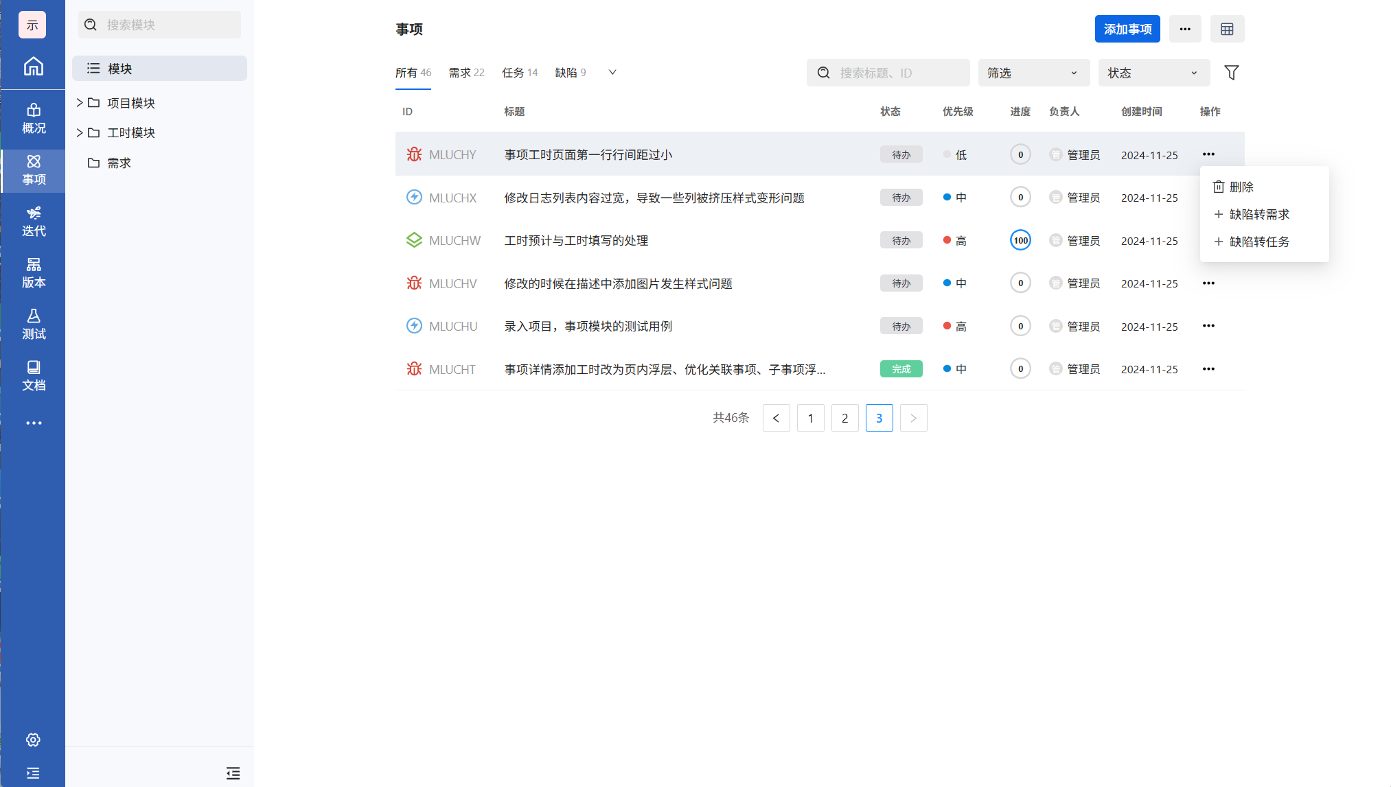 事项页面,点击缺陷的更多按钮,可以看到缺陷转需求和缺陷转为任务的按钮