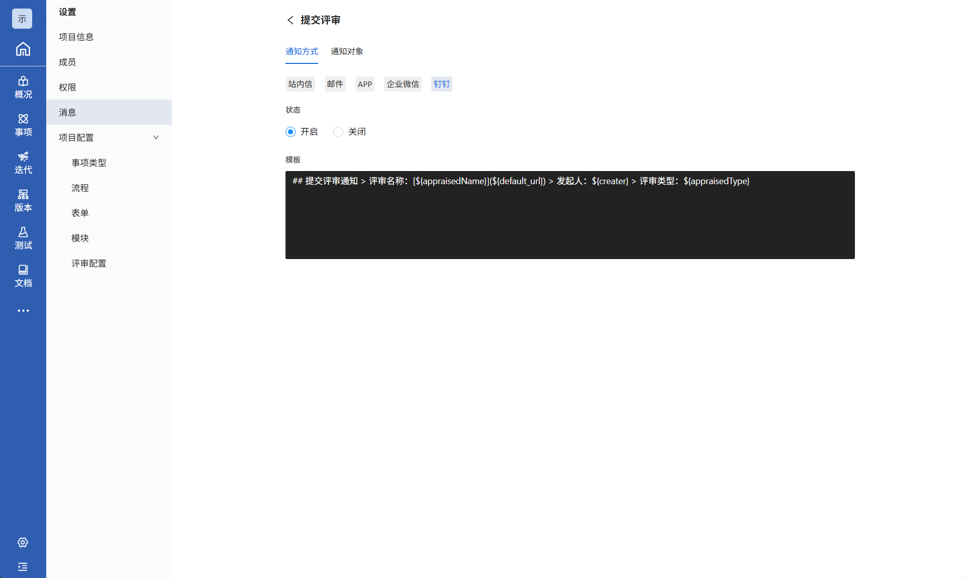 在消息通知方案页面,点击任意事件的名称进入配置详情页面。开启钉钉通知。在触发当前事件后,即可在钉钉群中收到通知消息