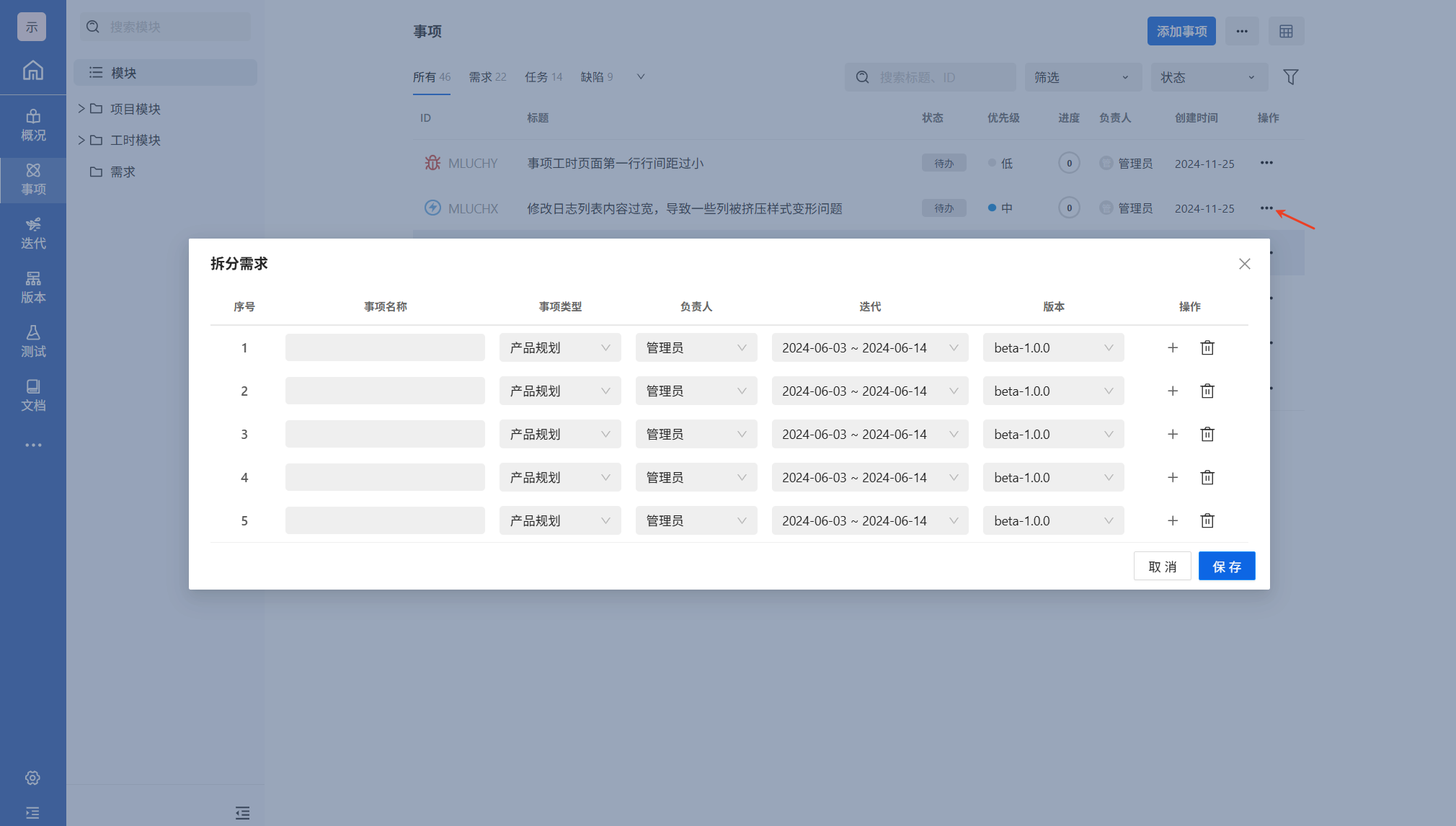 进入事项页面,点击需求或任务后的更多按钮,可以快速将需求或任务进行拆分