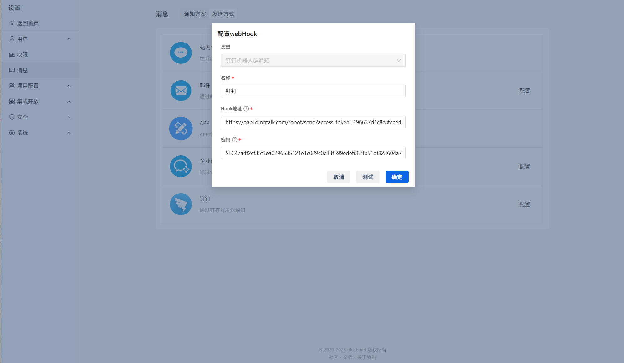 进入系统设置->消息->发送方式页面下,点击钉钉后的配置。填写信息并确定后,钉钉通知配置成功。