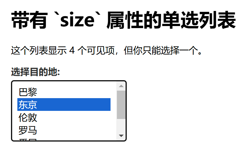 size > 1) :当size属性大于 1 且没有multiple属性时,<select>也会渲染为滚动列表框,但只能选择一个选项。