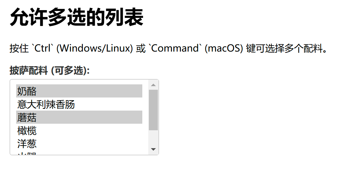 multiple属性存在时,<select>渲染为一个列表框,通常具有滚动条,用户可以按住 Ctrl/Cmd 键选择多个选项。 - 滚动选择框 (