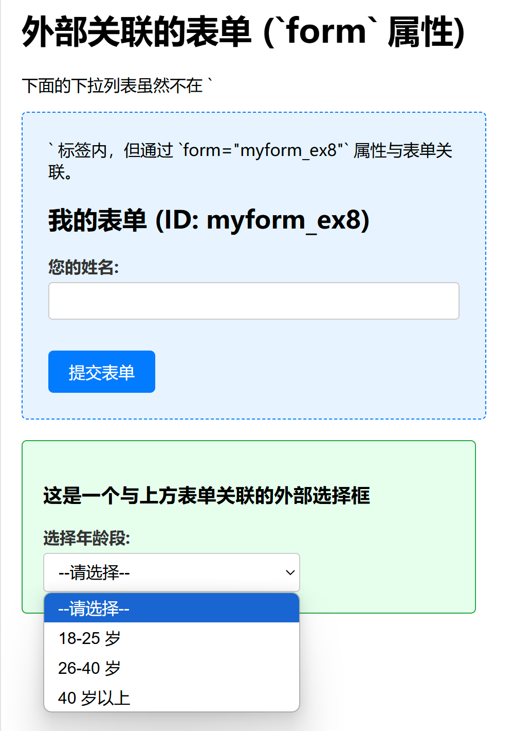 <p>下面的下拉列表虽然不在 `<form>` 标签内,但通过 `form="myform_ex8"` 属性与表单关联。</p>