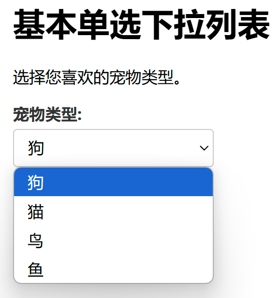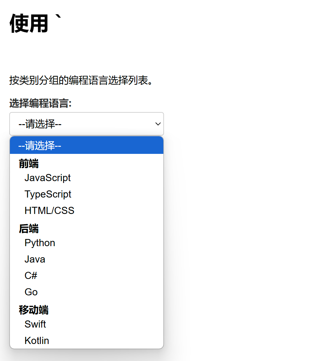 <label>标签结合使用时,<select>提供了良好的可访问性,屏幕阅读器等辅助技术能够清晰地传达选择项的上下文和功能。 - 表单结构:它作为标准表单控件的一部分,有助于构建语义清晰、结构良好的表单。