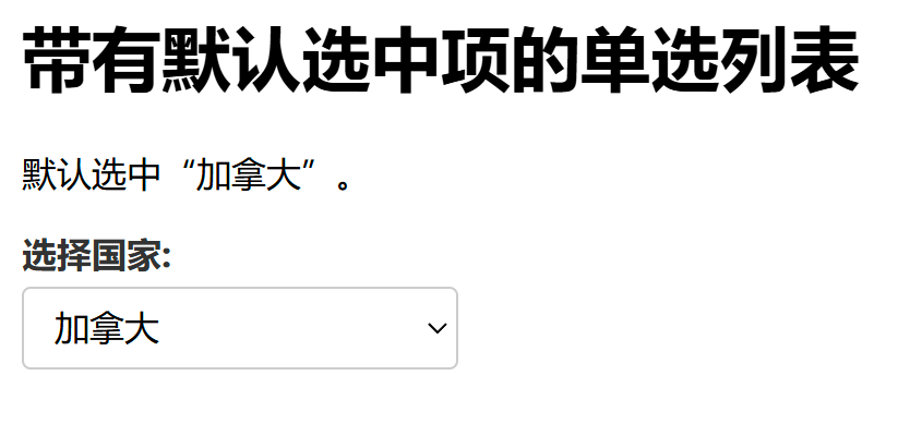 布尔属性 | 如果存在,则此选项在页面加载时默认被选中。如果一个 <select> 元素中没有 selected 属性的选项,浏览器通常会默认选中第一个选项。 |