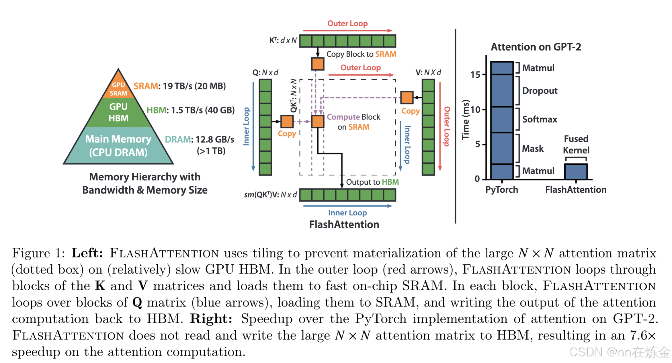 (2) IO 瓶颈:GPU 有两层核心内存 ------高带宽内存(HBM) (容量大但读写慢)和 片上静态缓存(SRAM) (容量小但读写极快)。标准自注意力会把 Q×K^T 这种超大中间结果存到 HBM,计算时反复读写 HBM 和 SRAM,导致 "IO 时间远大于计算时间"(例:n=4K 时,n×n=16M 元素,float16 下占 32MB,远超单 SM 的 192KB SRAM),GPU 算力完全没发挥。