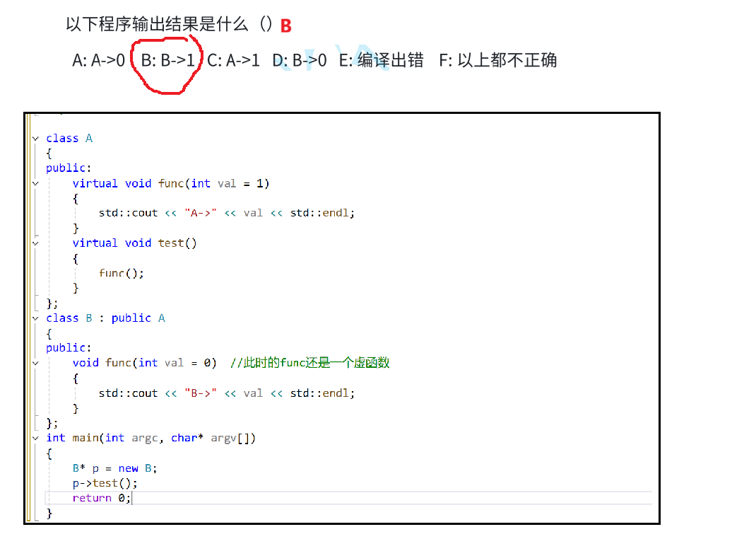 想必大家看到答案的时候可能有很多疑惑之处,具体来听我仔细讲解:我们现在的p虽然是B类型的,但是p调用的test并没有在B类中实现重写,所以编译器会默认使用A类的test,编译器在编译 A::test() 时,看到的是调用 func(),它知道 func 是虚函数,因此不会直接编译成调用 A::func()。它会生成一段代码,在运行时根据对象的实际类型(动态类型)去查找虚函数表(vtable),然后调用对应的函数。所以运行时会动态绑定到B::func(),但是func的默认参数是编译期绑定的,所以默认参数会绑定A::func的val=1,所以最终输出的应该是B->1;