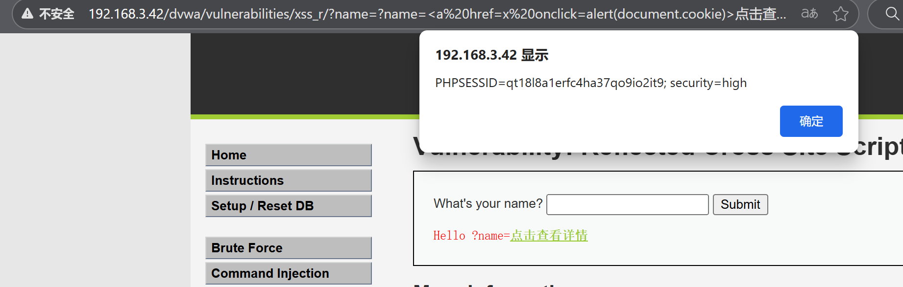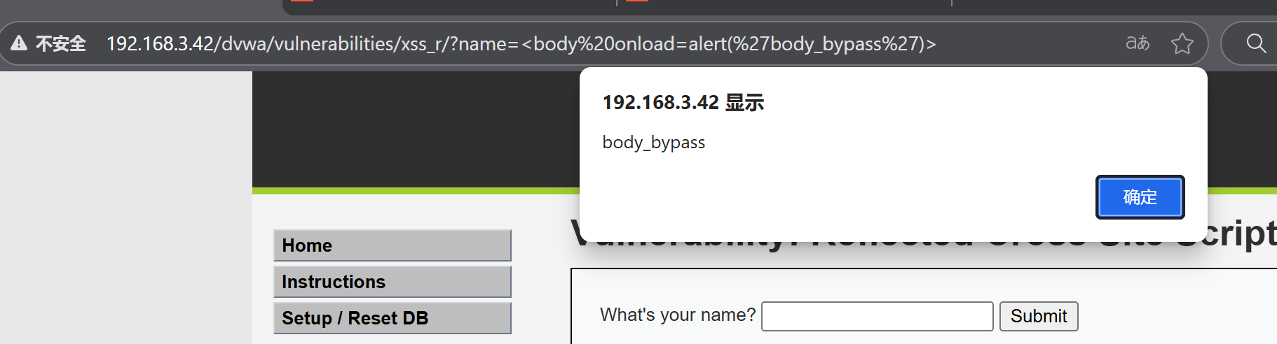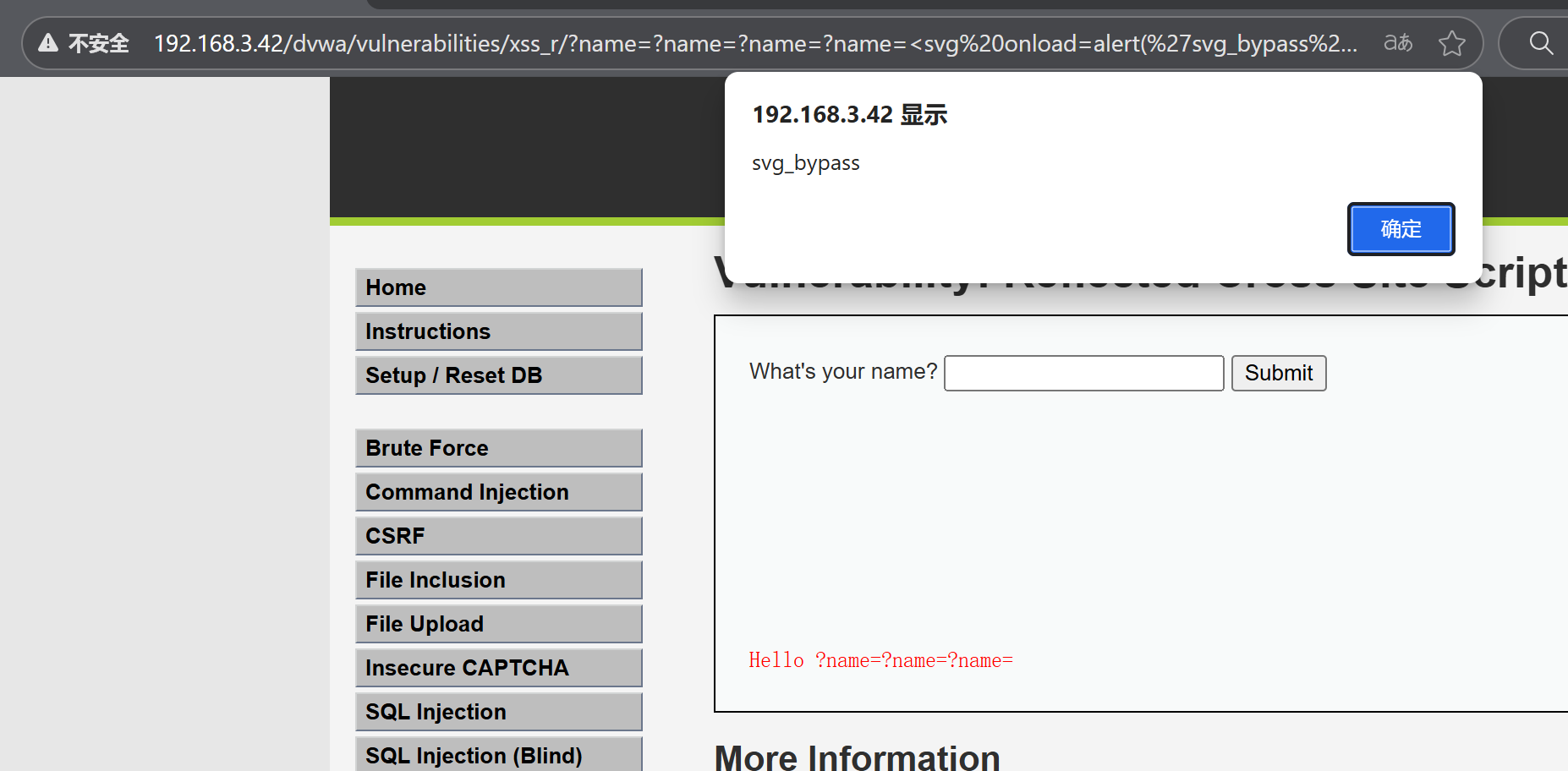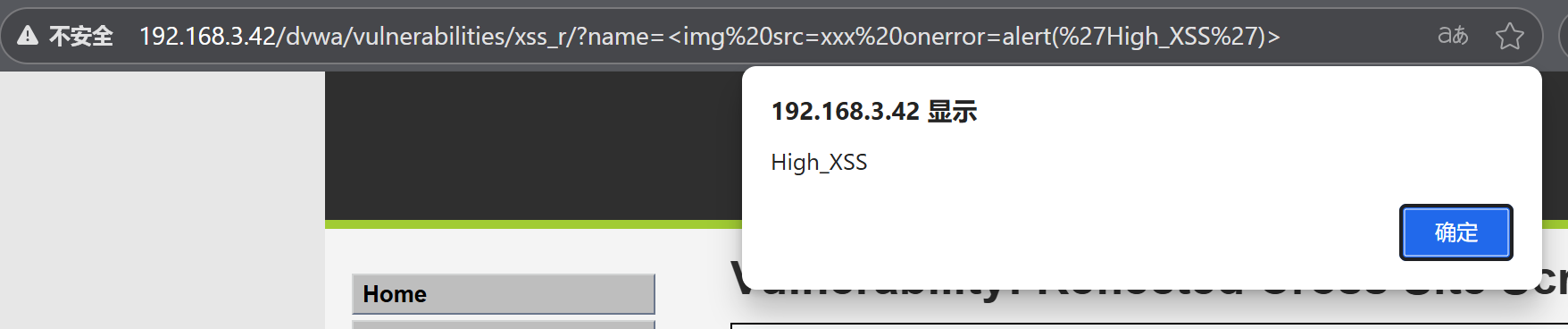 http://192.168.3.42/dvwa/vulnerabilities/xss_r/?name=\<img src=xxx οnerrοr=alert('High_XSS')>