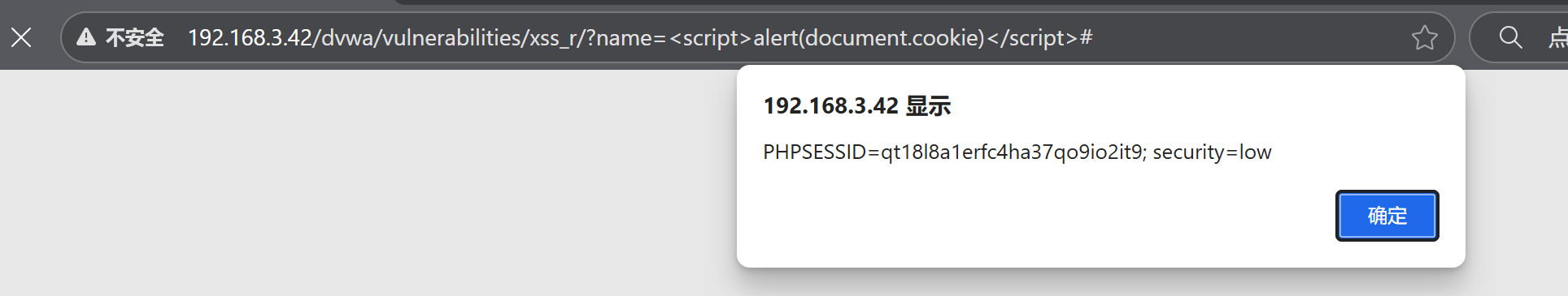 http://192.168.3.42/dvwa/vulnerabilities/xss_r/?name=\<img src=1 οnerrοr=alert(document.cookie)>