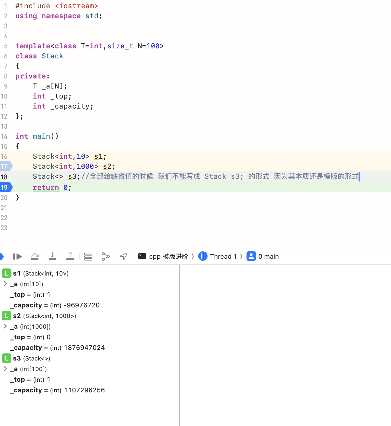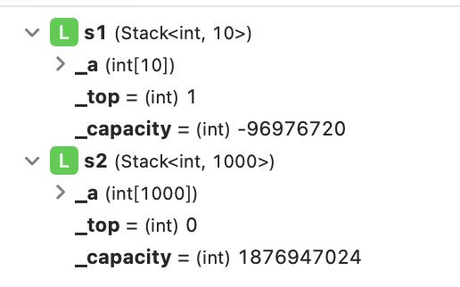 Stack<int,10>和Stack<int,1000>此时双方已经是两个不同的类。>我们调试的时候可以看到他们大小不同: