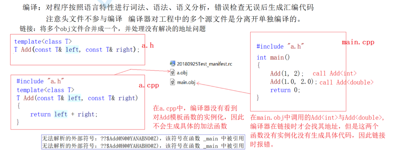 函数模版的实例化在main.cpp文件中,但是函数模版定义确在a.cpp中 他们在链接前是不会交互的 所以根本不会生成对于加法函数 所以编译器链接时候根本找不到函数地址!
