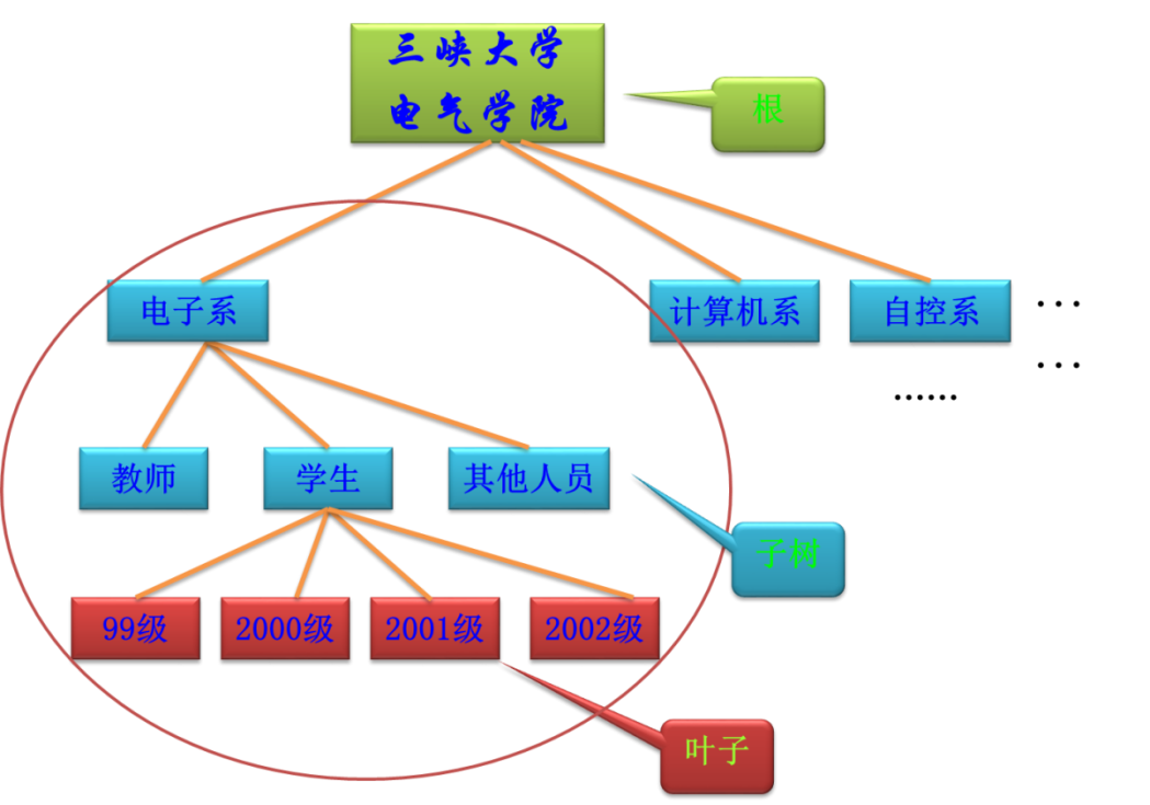 由一个或多个(n≥0)结点组成的有限集合T,有且仅有一个结点称为根(root),当n>1时,其余的结点分为m(m≥0)个互不相交的有限集合T1,T2,...,Tm。每个集合本身又是棵树,被称作这个根的子树 。